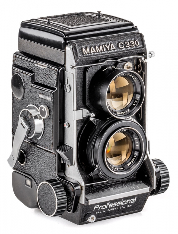 Un Mamiya C 330 avec trois groupes optiques, 180, 80 et 55 millimètres, années 1970.